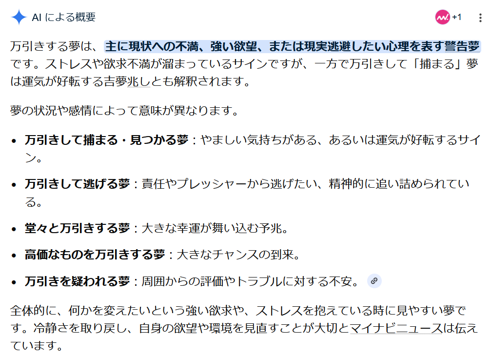 「万引きをして逃げる夢」に相当するかなと思いますが、「責任やプレッシャーから逃げたい、精神的に追い詰められている」とあります。一番最後の文章を読むと、「何かを変えたいという強い欲求や、ストレスを抱えている時に見やすい夢です。冷静さを取り戻し、自身の欲望や環境を見直すことが大切」とのこと。